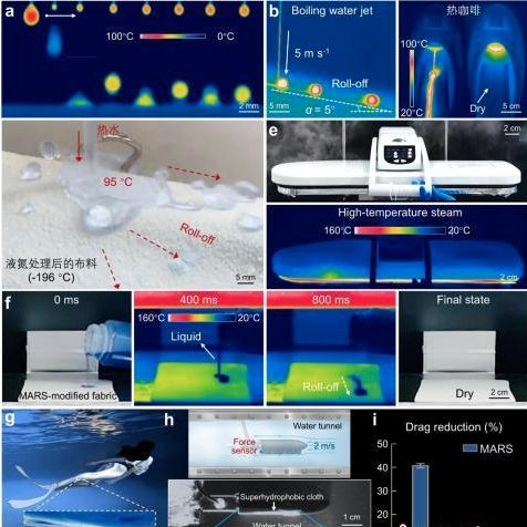 极端温度耐受性实验显示,MARS织物具备优异的热稳定性:无论是刚煮沸的开水或9巴(bar)压力胶囊咖啡机挤出的咖啡,均无法破坏其超疏水状态;即使经过160°C高温熨烫处理,其超疏水特性仍丝毫未受影响;甚至在95°C热水与-196°C液氮的极端冷热循环冲击下,织物性能依旧稳定。