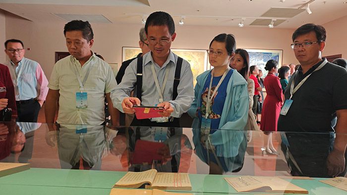 2024年9月,潘柏年夫妇等参加融合发展主题研修活动的近30位大陆任教台湾教师走进北京、河北、天津。图为潘柏年(右三)在中国国家版本馆参观、拍照。(图/中新社)