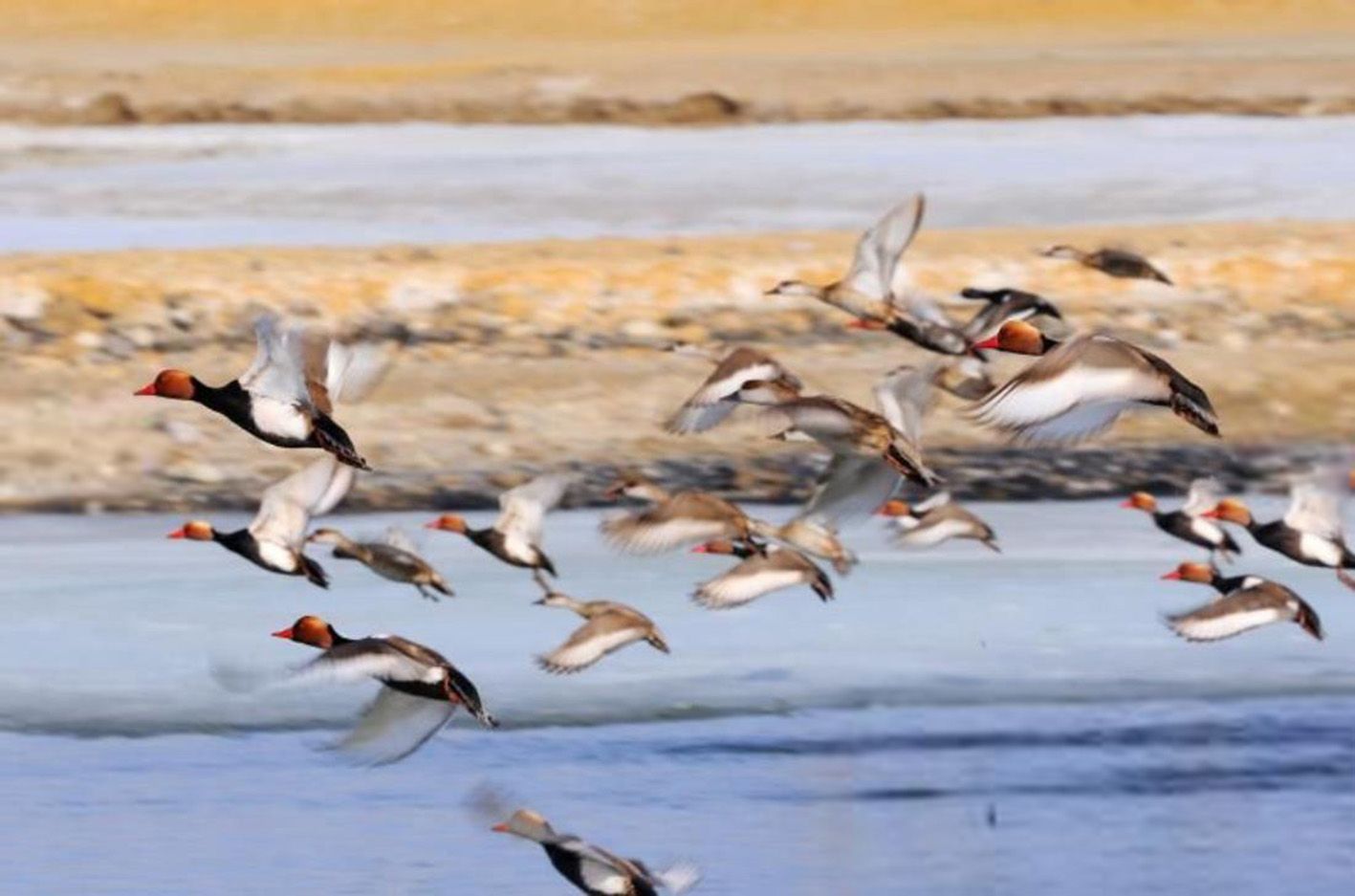 3月23日,成群的赤嘴潜鸭等候鸟在新疆福海县乌伦古湖国家湿地公园栖息飞翔。春分以后,随着天气渐暖,栖息在新疆福海县乌伦古湖国家湿地公园的候鸟疣鼻天鹅、赤嘴潜鸭等候鸟也活跃起来,它们时而悠闲栖息,时而成群飞翔,让湿地公园充满生机。(中新社)