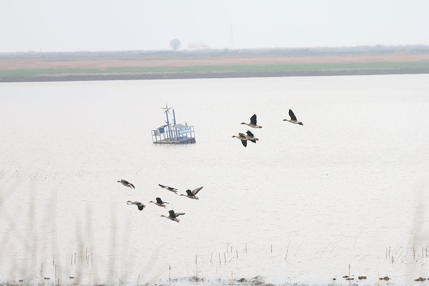 3月21日,江西永修鄱阳湖吴城候鸟小镇,候鸟从水面上低空掠过。地处鄱阳湖、赣江与修河交汇处的吴城镇是江西四大古镇之一,因每年冬季有数十万只候鸟到此越冬,被称为“中国候鸟小镇”。(中新社)
