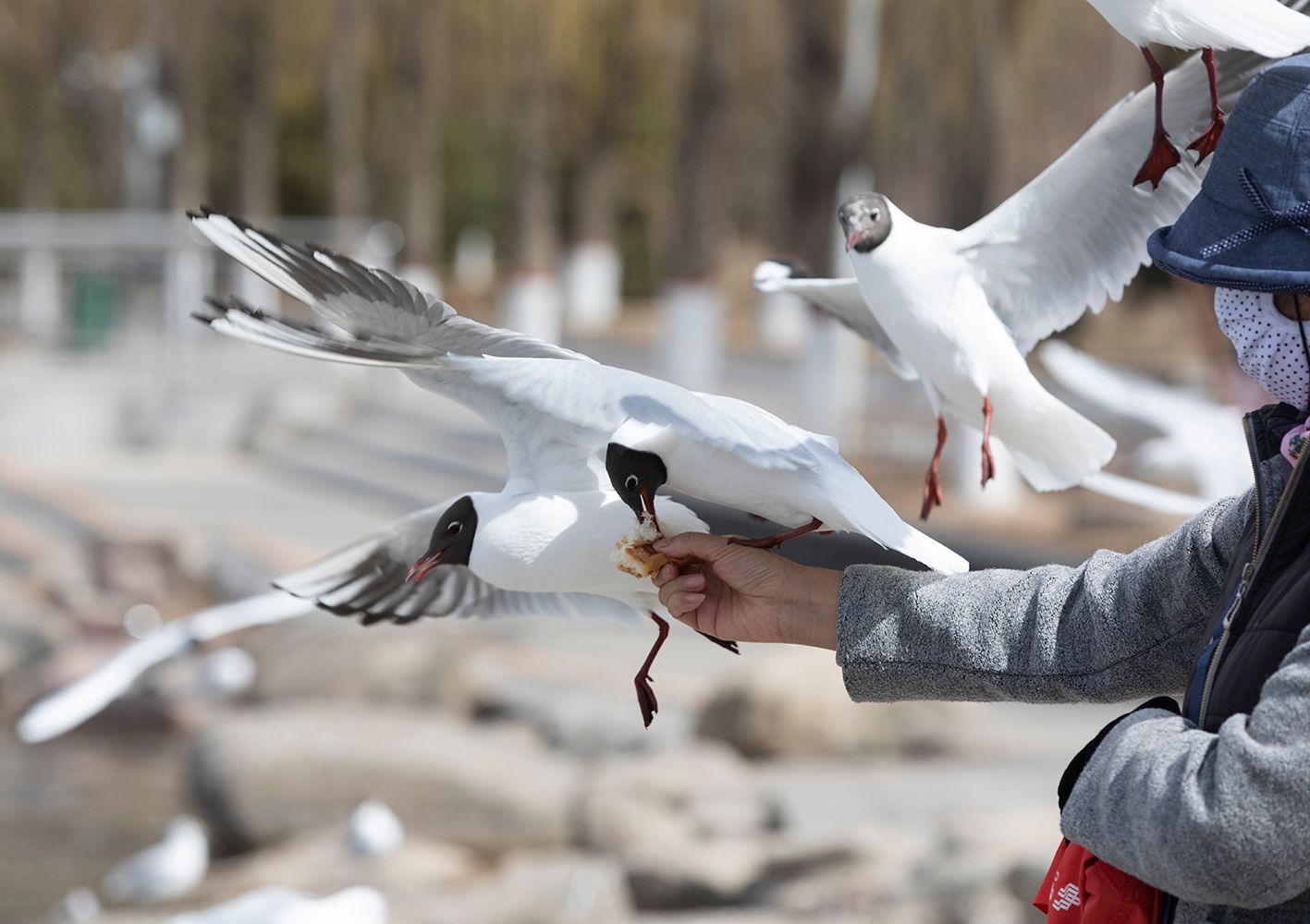 近日,宁夏银川北塔湖边,市民与红嘴鸥等候鸟互动。有“塞上湖城”之称的银川市拥有5.3万公顷湿地与近200个自然湖泊、沼泽湿地,是东亚—澳大利西亚候鸟迁飞路线上的重要驿站。(中新社)