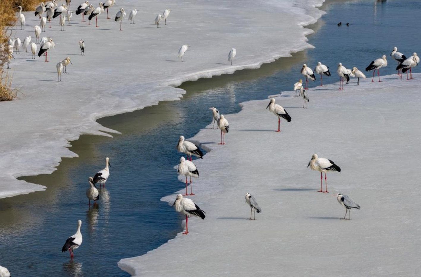 随着气温回升,北京市密云区迎来了春季候鸟迁徙高峰。3月中旬,39只东方白鹳飞抵密云水库,这是近十年来该物种在密云单次观测数量的最高纪录。(人民网)