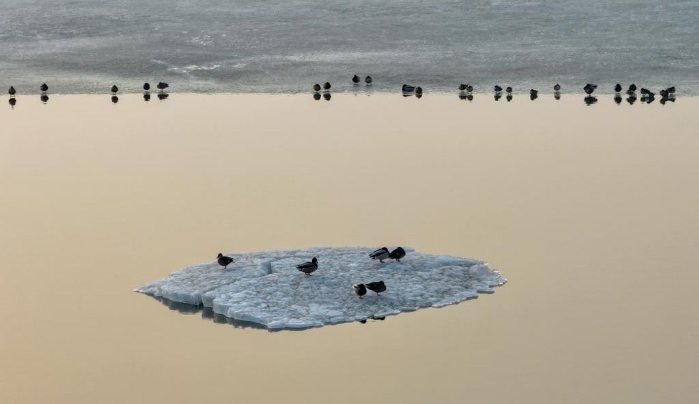 3月23日,在黑龙江省双鸭山市宝清县境内的黑龙江东升省级自然保护区内,一群候鸟在冰面上休息(无人机照片)。(新华社)