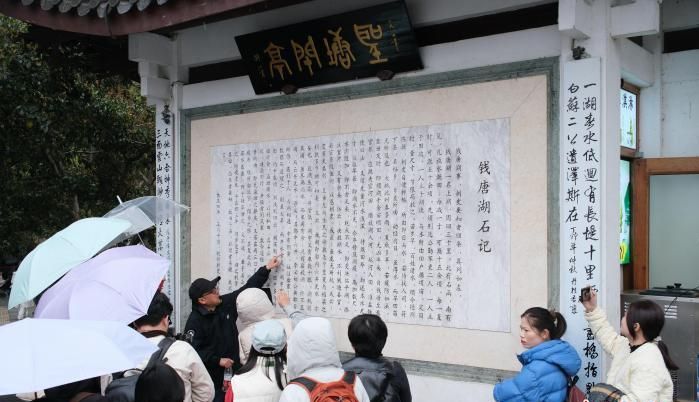 在西湖六公园北侧,圣塘闸亭的白墙上,抄录着白居易写给杭州百姓的《钱塘湖石记》。这篇文章详细说明了西湖的灌溉功能、六井的运作原理,以及如何管理水位、何时开闸放水。这份西湖的“使用说明书”,不仅是为后来的治杭者而写,更是向普通百姓广而告之。