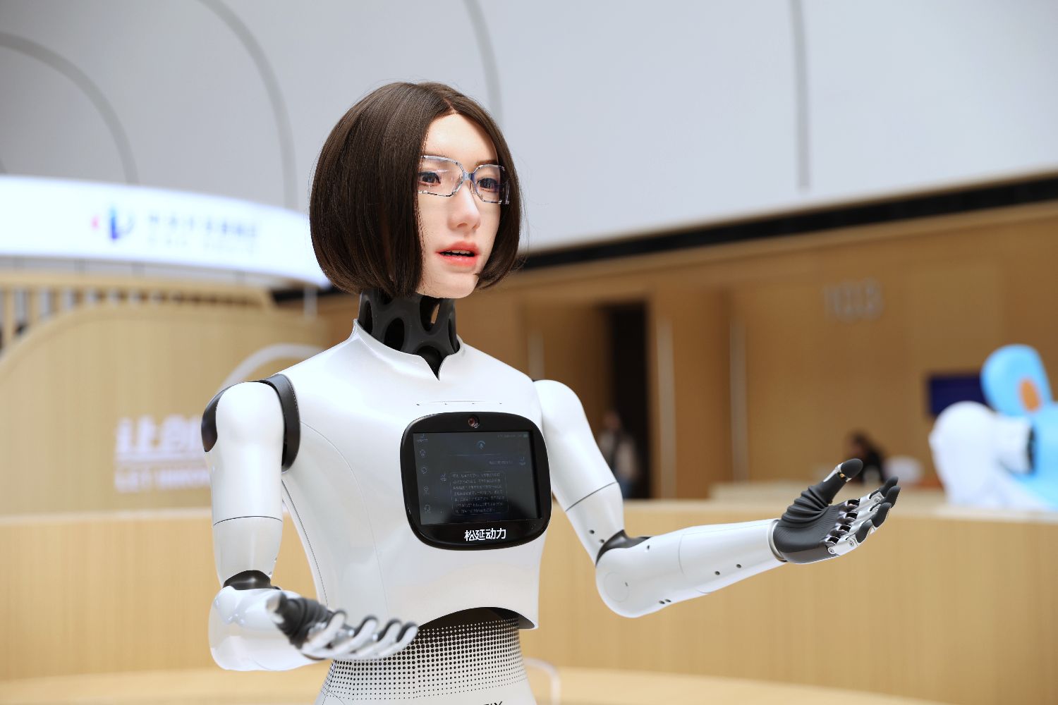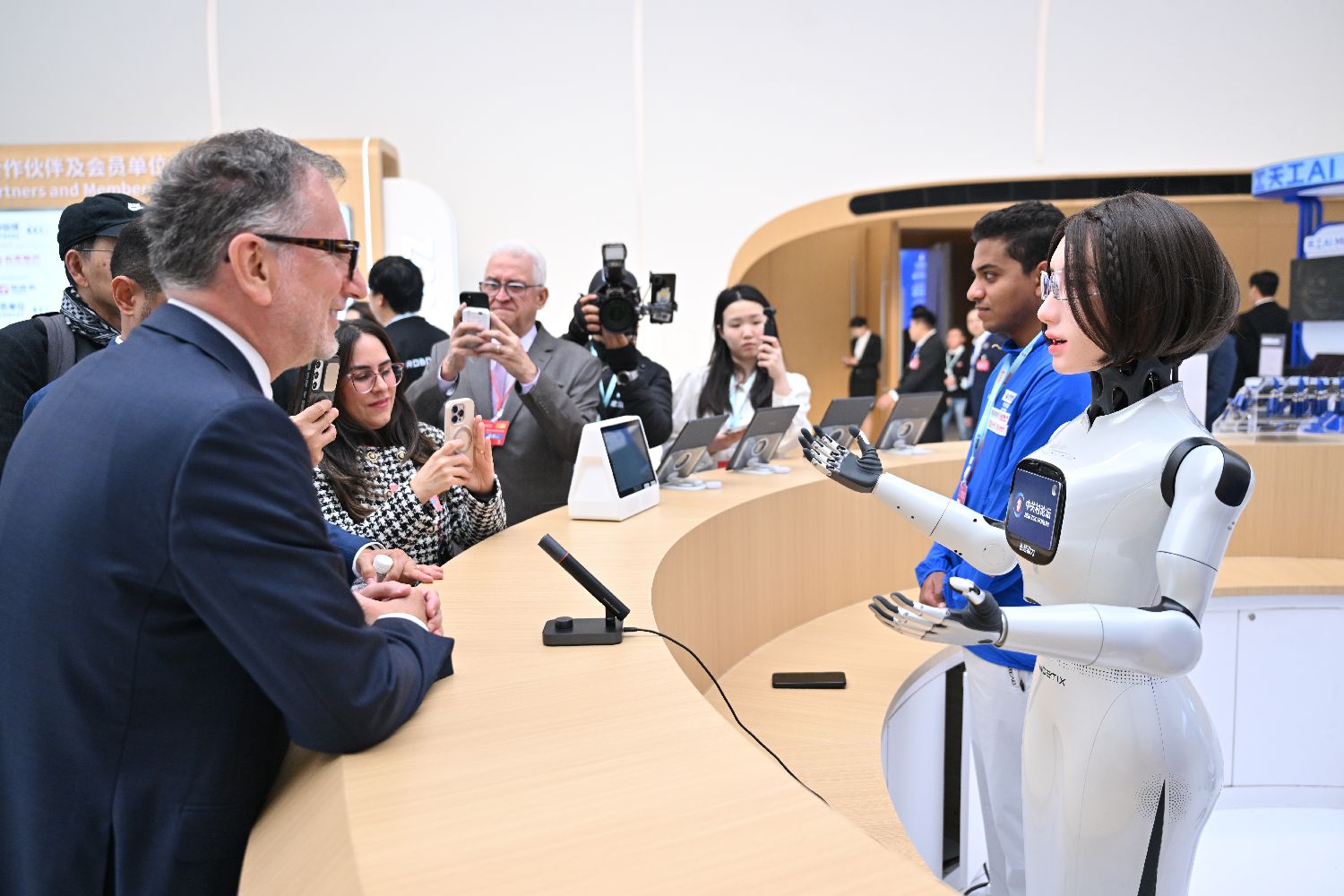 3月24日,在2026中关村论坛年会主会场,接待机器人小诺。(中新网)