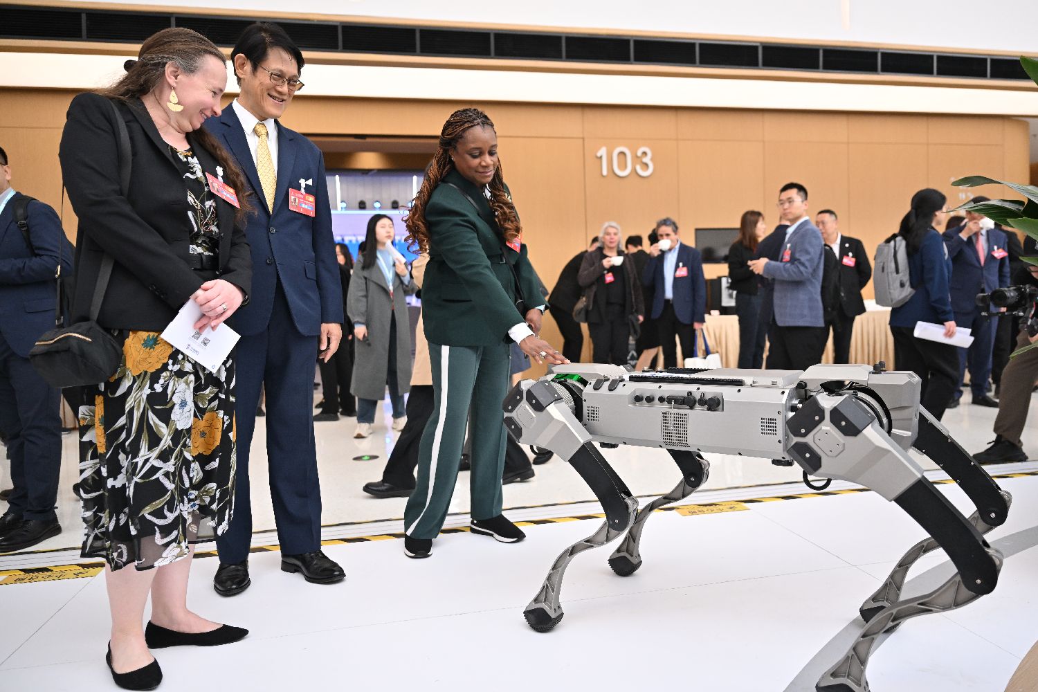 3月25日,机器狗吸引与会外籍嘉宾。(中新社)