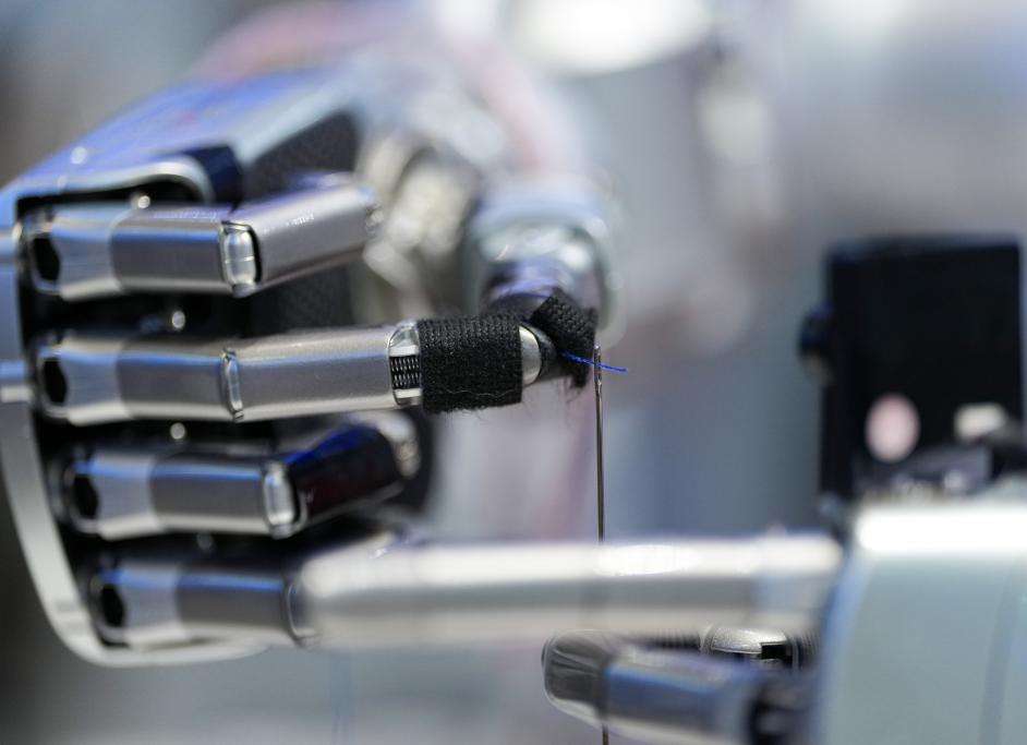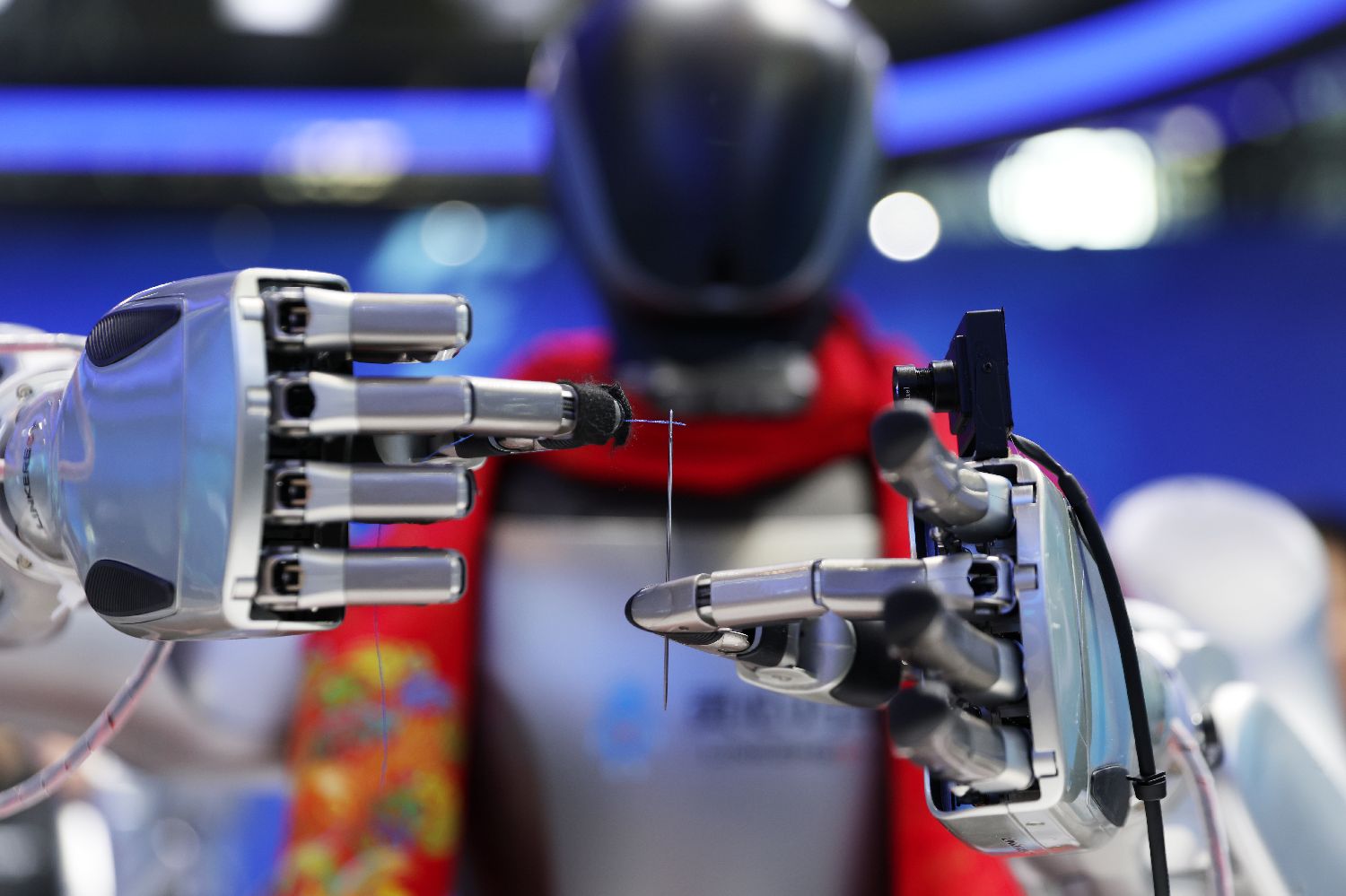 3月24日,在中关村展示中心常设展上,一台配备了灵巧手的机器人在展示穿针引线。(新华社)