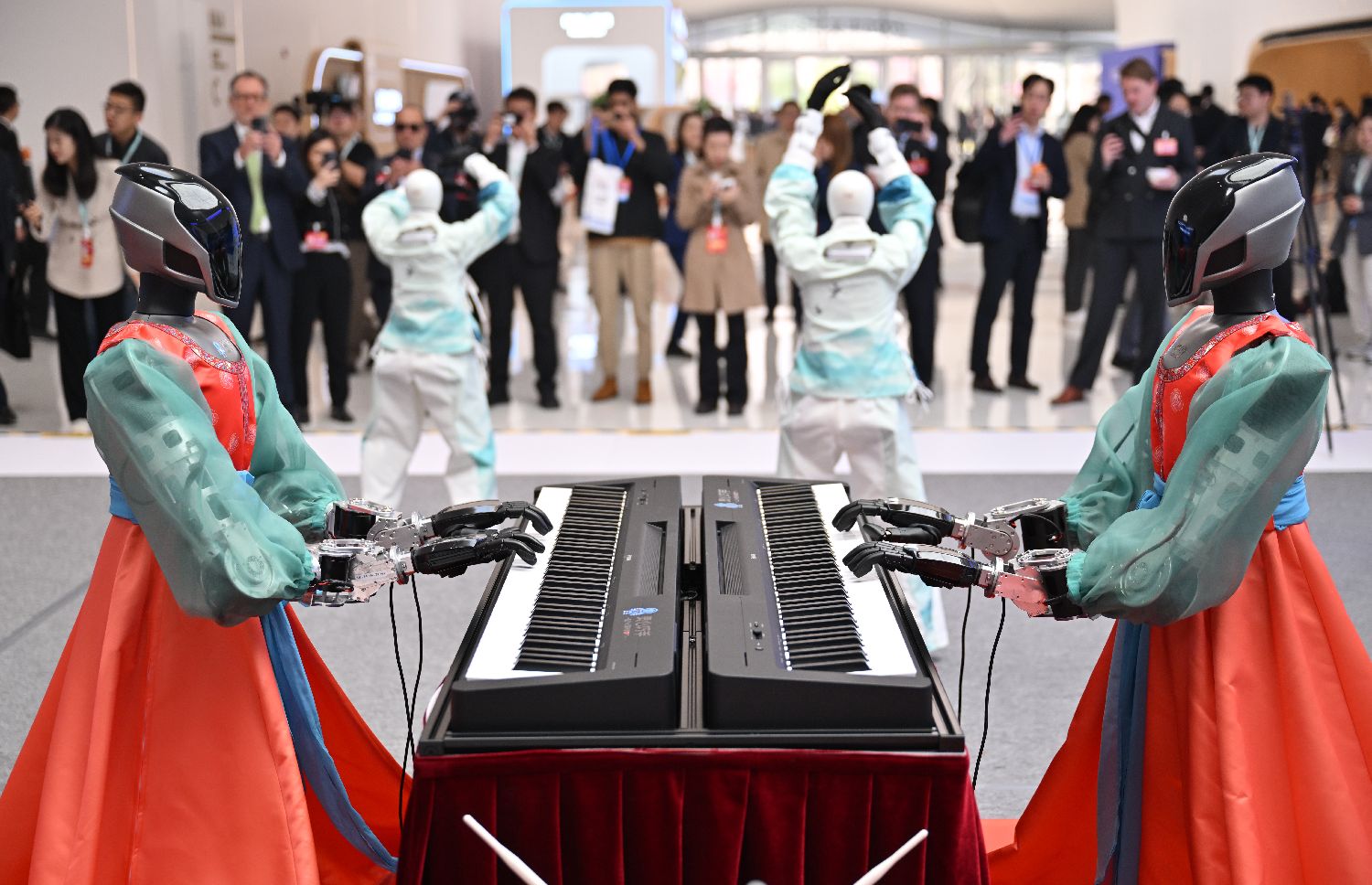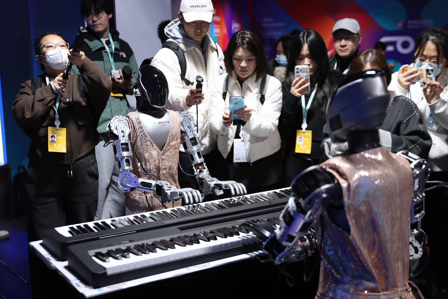 3月24日,在2026中关村论坛年会新闻中心,弹钢琴的机器人吸引媒体记者。(中新网)