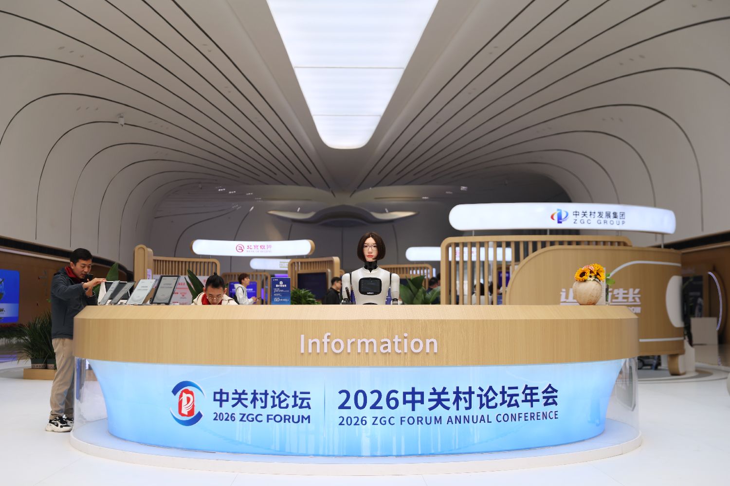 3月25日,2026中关村论坛年会在北京正式启幕,本届论坛年会主题为“科技创新与产业创新深度融合”,3月25日至29日期间举办论坛会议、成果发布、技术交易、前沿大赛、配套活动五大板块百余场活动。论坛强化科技办会理念,机器人组团服务、AR翻译眼镜、AI同传等前沿技术全面落地应用,尽显前沿科技与产业创新深度融合的独特魅力。图为开幕式前,“迎宾”机器人小诺(右)为与会外籍嘉宾提供咨询服务。(中新社)