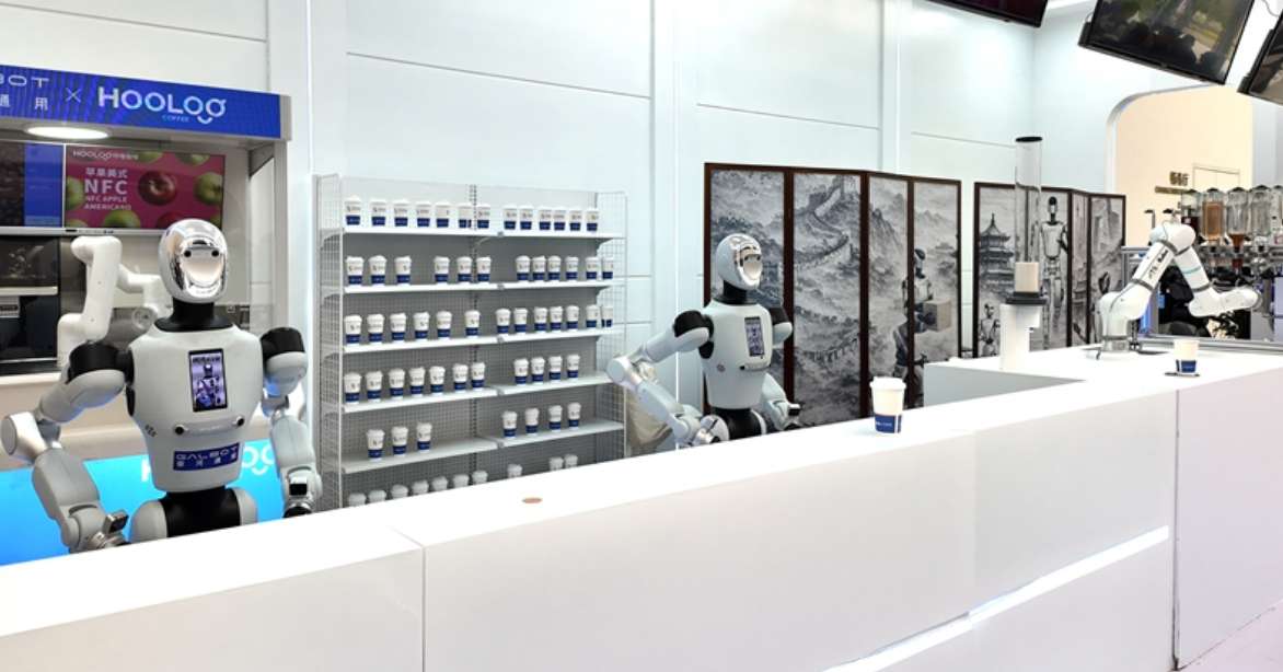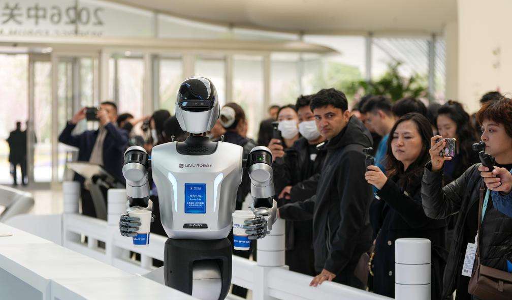 串糖葫芦、做茶饮、卖糖火烧……在中关村国际创新中心里,机器人“组团”开起了餐吧,卖起了北京传统小吃。与往年的机器人单一餐饮服务场景不同,今年,5款来自不同公司的机器人打起了配合,它们各司其职,有的精准地把一颗颗山楂球串成串,有的小心翼翼地拿取易碎的点心,还有的跑前跑后为嘉宾上餐。图为机器人餐吧亮相中关村论坛。(人民网)