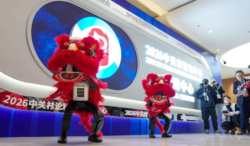 3月24日,在中关村论坛年会新闻中心内,两台人形机器人在表演舞狮。(新华社)