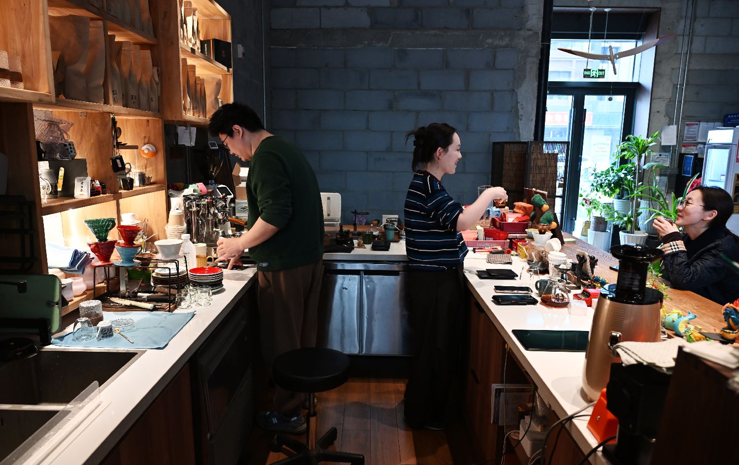 3月20日,李丛臣(左)与张玥(中)在咖啡店忙碌。(图/中新社)