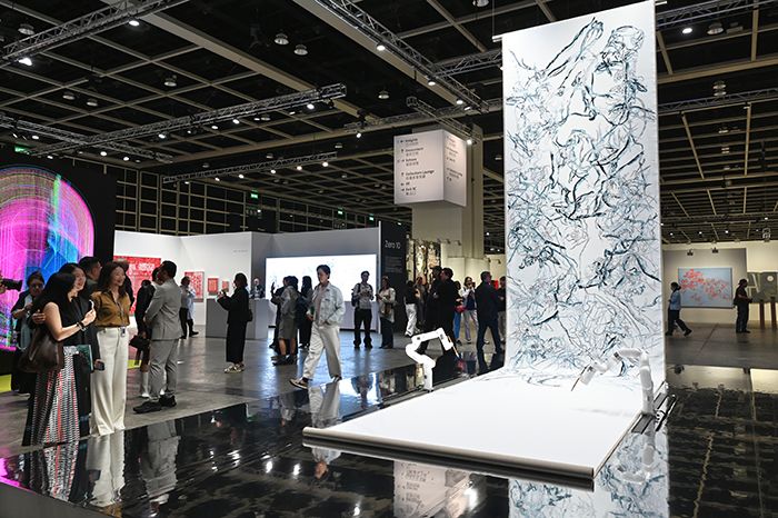 3月25日,2026年巴塞尔艺术展(ArtBasel)香港展会在香港会议展览中心举行预展活动。图为现场人士参观用机械臂绘制的艺术品。(图/中新社)