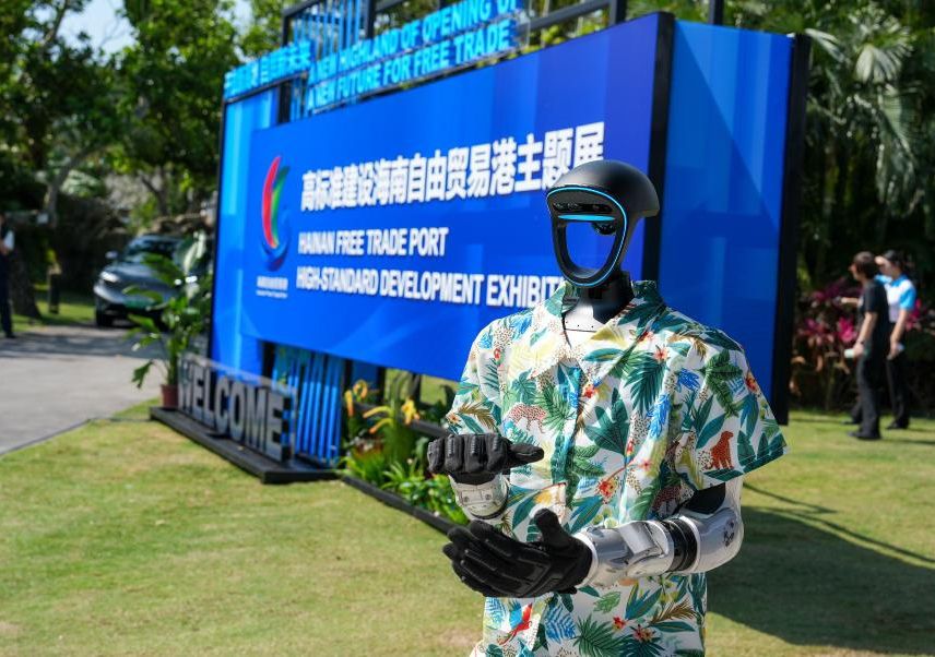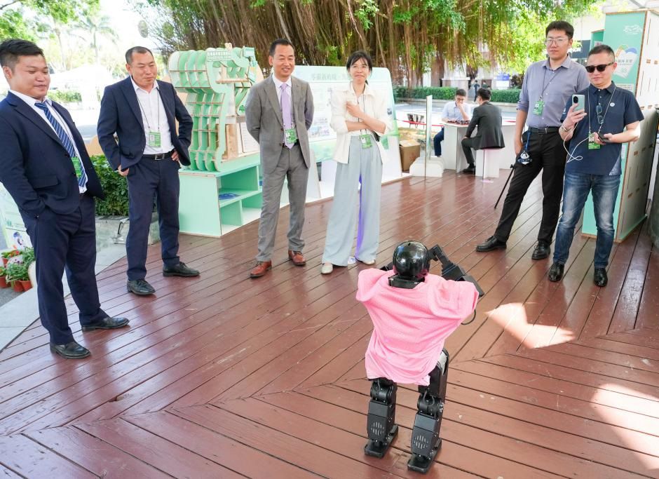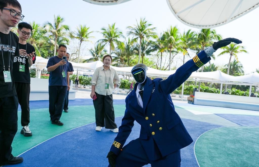 3月24日,人形机器人在位于海南省琼海市博鳌镇东屿岛的高标准建设海南自由贸易港主题展上迎宾。(新华社)