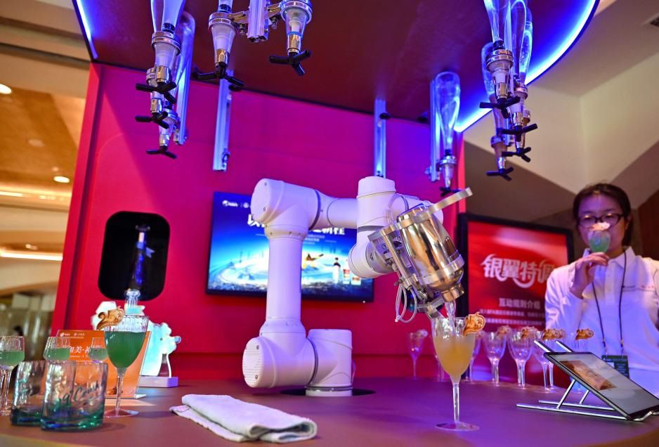 3月25日,一款调酒机器人在博鳌亚洲论坛大酒店为参会人员调酒。(新华社)
