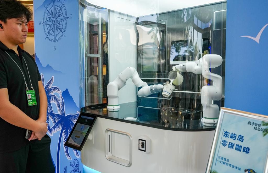3月24日,在海南省琼海市博鳌镇东屿岛的零碳智屋,机器臂为宾客制作咖啡。(新华社)