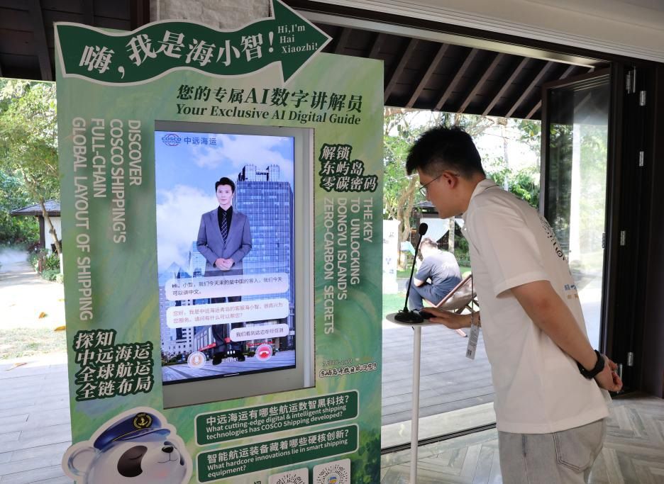 3月25日,工作人员在博鳌亚洲论坛年会会场与AI数字讲解员对话。(新华社)