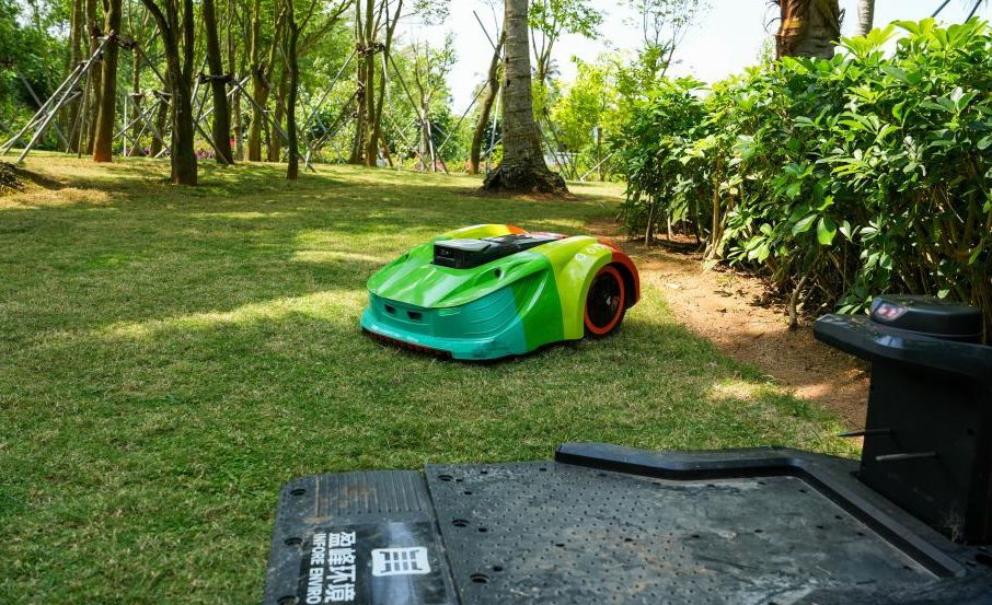 3月25日,智能无人割草机在中国(海南)南海博物馆周边草坪上作业。(新华社)