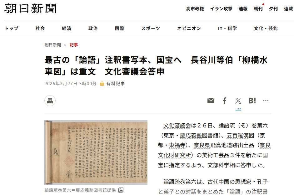 现存《论语》最古老手写本被指定为日本国宝。(图/《朝日新闻》报道截图)