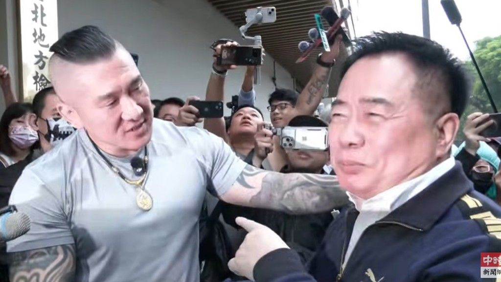 台湾前立委蔡正元(右)27日在网红“馆长”陈之汉(左)以及数十名支持者声援下入狱服刑。(图/台北中时新闻网)
