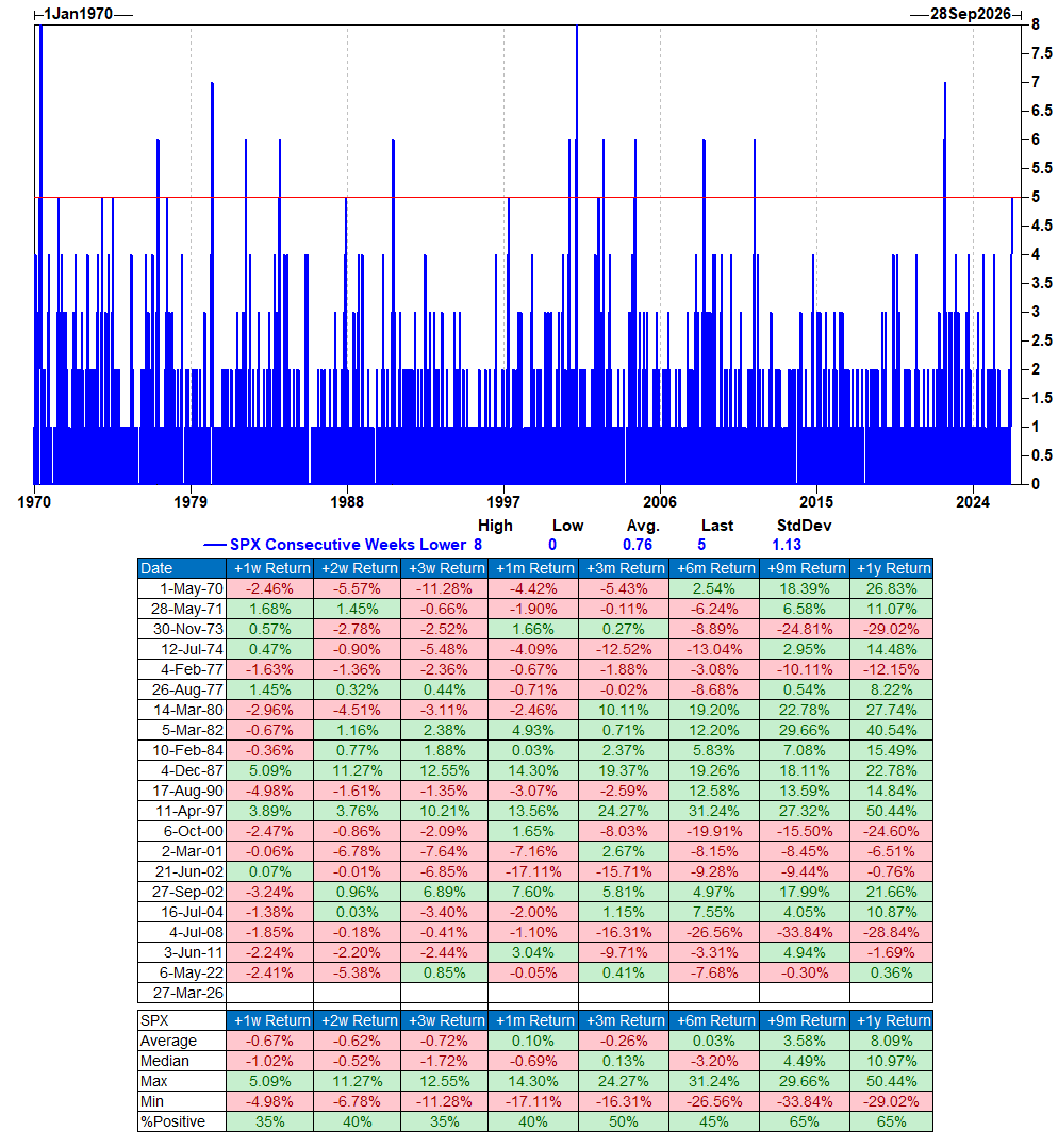 摩根在报告中指出,标普500指数连续五周下跌,这一现象自1970年以来仅出现过寥寥数次。最近一次类似走势发生在2022年经济衰退恐慌期间。即便是在新冠疫情引发的股市暴跌,或是去年4月“关税日”引发的市场崩盘中,标普500指数也未曾出现连续五周收跌的局面。