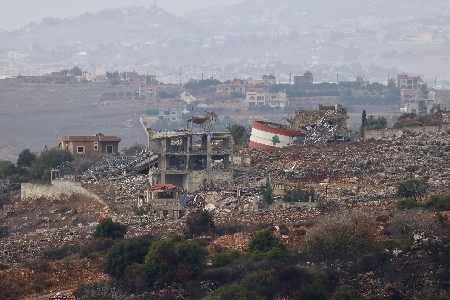 图为从黎巴嫩和以色列边境地区以色列一侧拍摄的黎南部损毁建筑。(图/新华社)