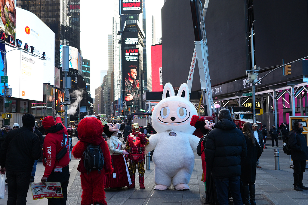 1月22日,一名“拉布布”扮演者现身美国纽约时报广场引起人们关注。“拉布布”是一款来自中国的潮玩,正在全球流行。(视觉中国)