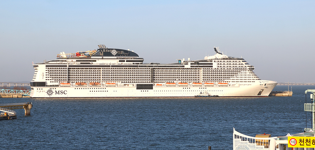 2月6日,韩国仁川延寿区国际邮轮码头迎来MSC Bellissima号,船上3000余名中国游客入境。(视觉中国)