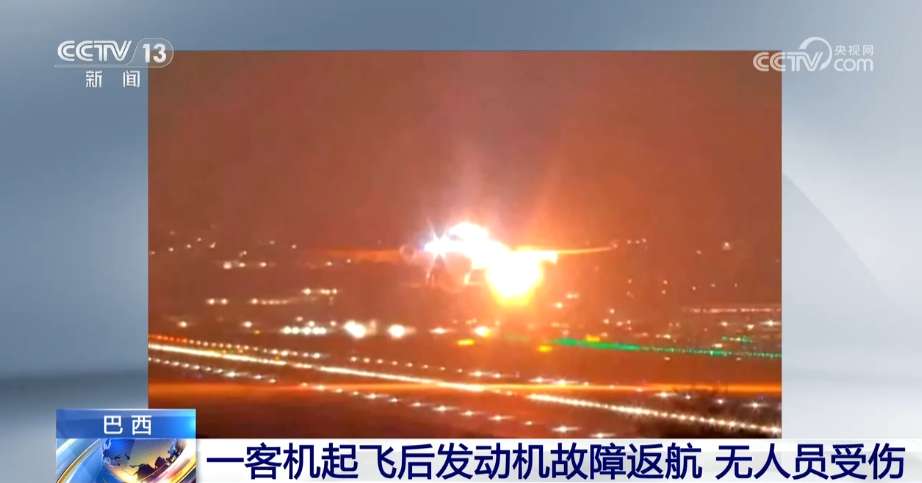 一架巴西飞美国客机29日起飞后不久,发动机出现故障,飞机随即返航并安全降落,未造成人员伤亡。(图/中国央视新闻视频截图)