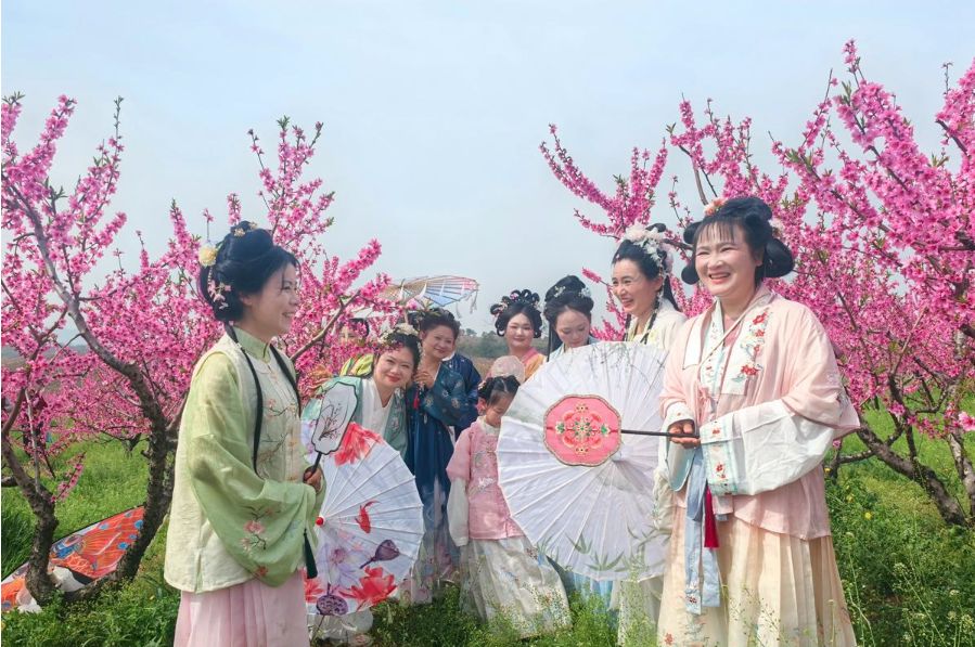 湖北万亩桃花闹春光,游人赏景作画逛市集