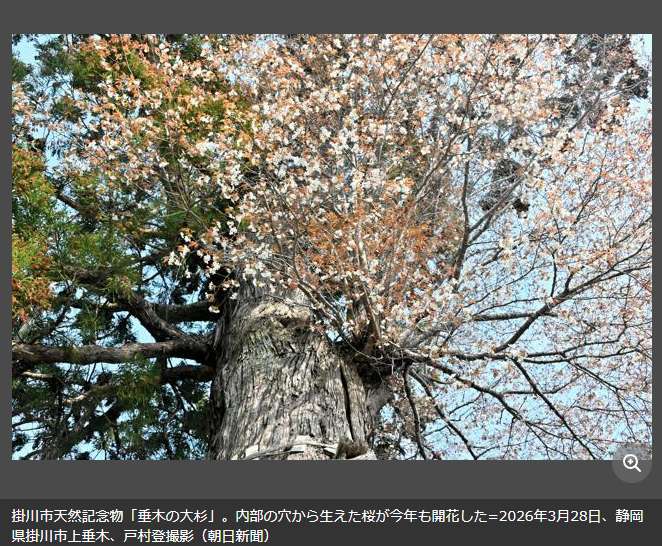 《朝日新闻》31日报道,这株被命名为“共生樱”的山樱,从杉树的树干上生长出来,绽放出洁白的花朵。如今正值最佳观赏期,许多游客慕名前往,只为一睹这个罕见景象。