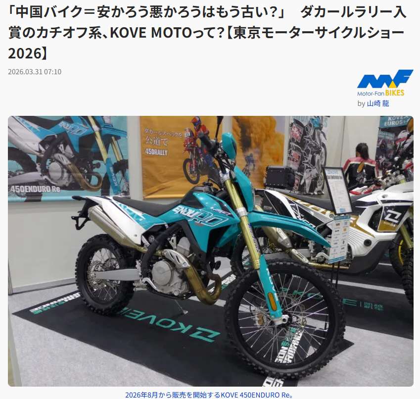 3月27日至3月29日举办的第53届东京摩托车展上,活跃于达喀尔拉力赛、世界超级摩托车锦标赛SSP300组别等多项摩托赛事的新锐中国厂商——KOVE(凯越)携旗下摩托产品亮相。(图/Motor-Fan报道截图)