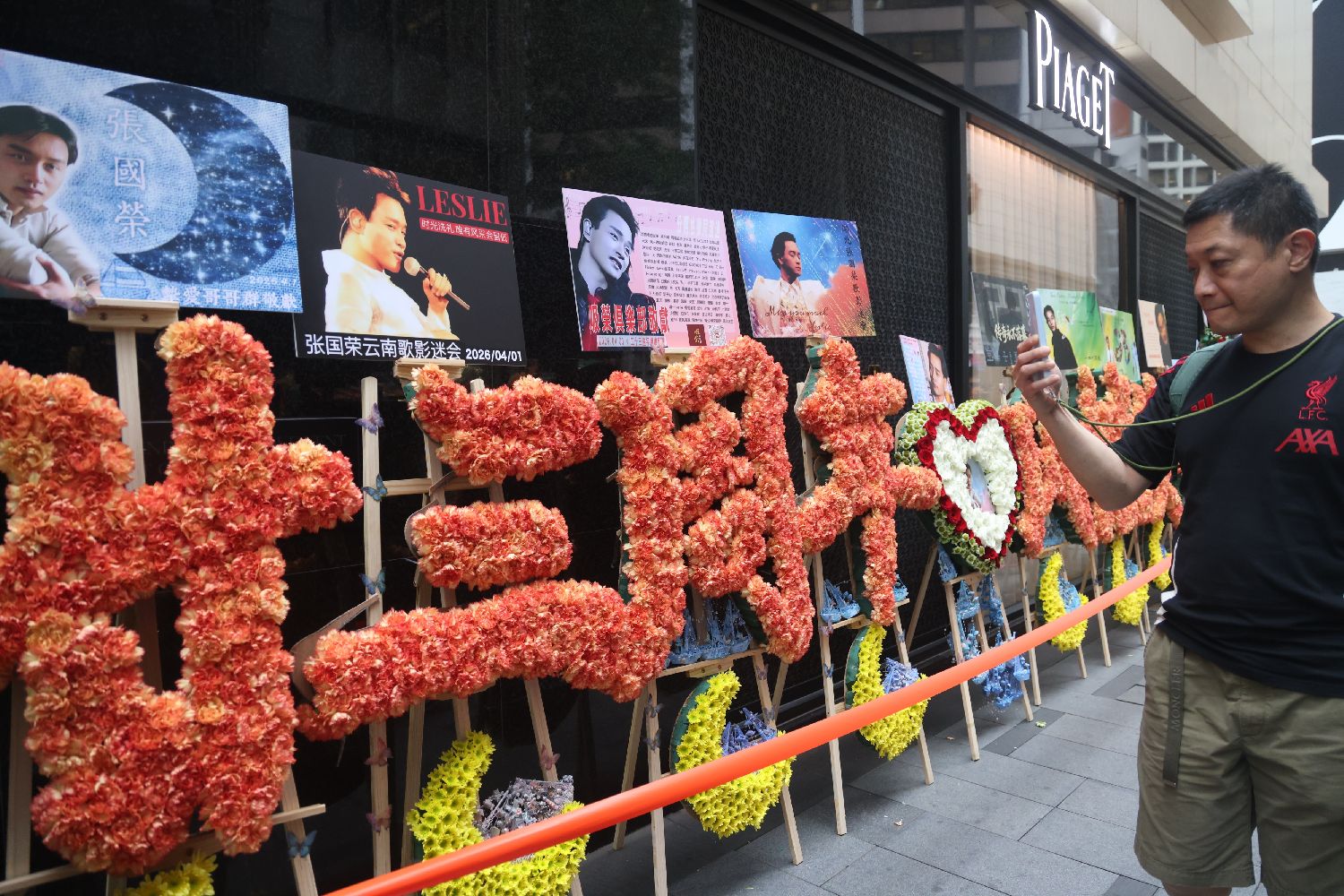 3月31日,香港文华东方酒店外人行道摆满鲜花、花牌与纪念展板,用以纪念张国荣逝世23周年。尽管正式忌日为4月1日,已有部分市民和来自各地的歌影迷提前抵达现场并拍照悼念。(香港中通社)