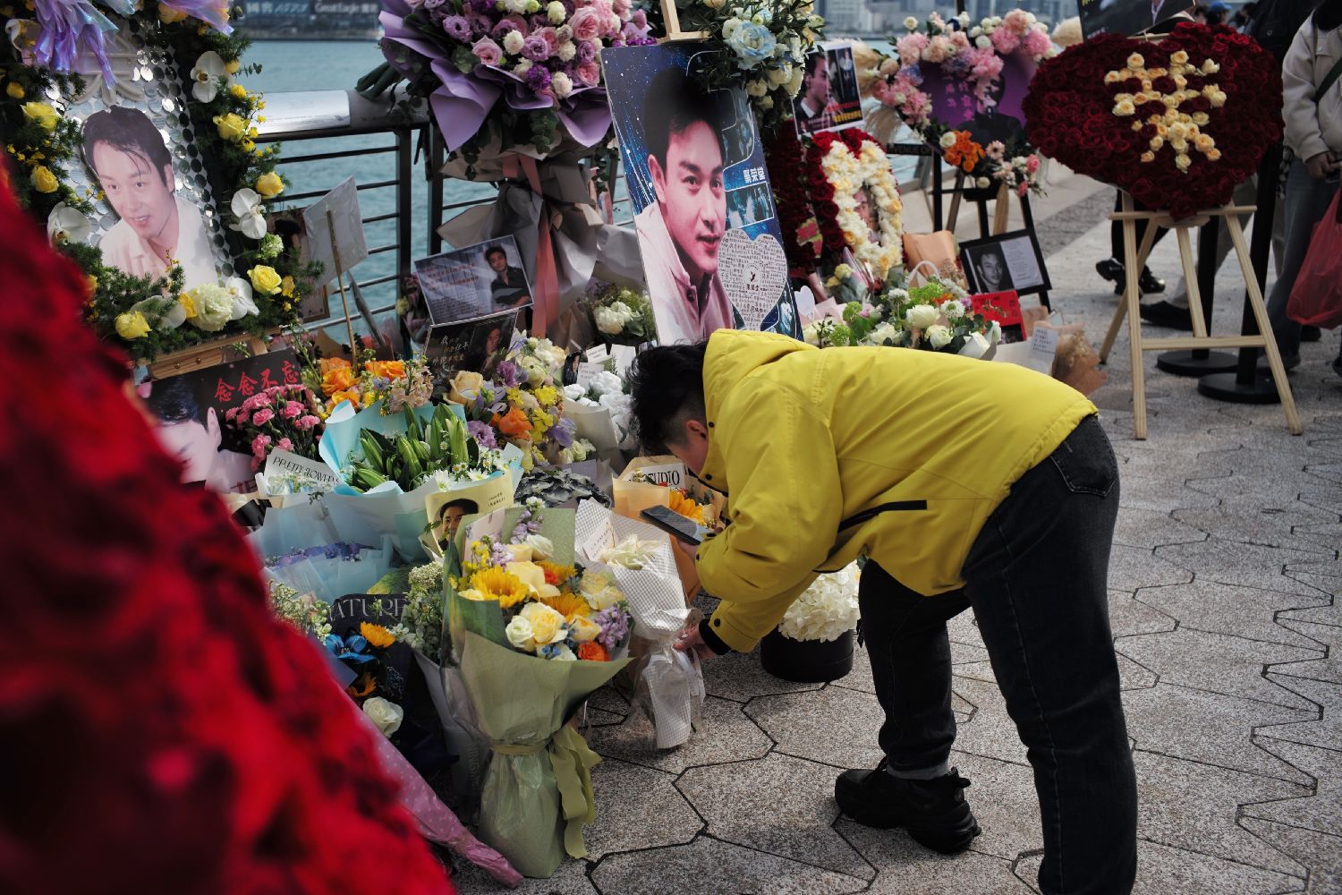 众多歌迷在香港星光大道献花悼念张国荣。4月1日,来自世界各地的张国荣歌迷聚集在香港星光大道的张国荣手印前,献花悼念香港著名艺人张国荣逝世23周年。(香港中通社)