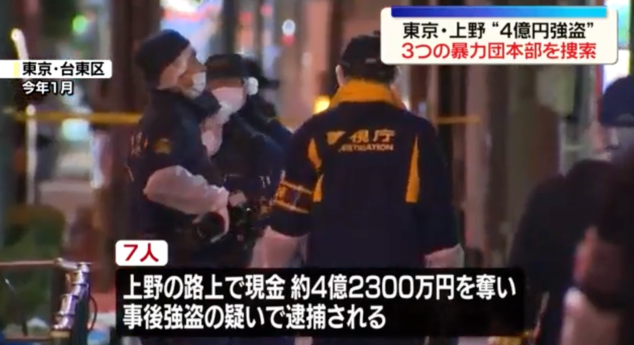 (亚太快讯消息)针对此前发生在东京上野、涉案金额超过4亿日元的巨额现金抢劫案,日本警视厅于近日采取大规模行动,对三个关联暴力团的总部进行了突击家宅搜索(入室搜查)。