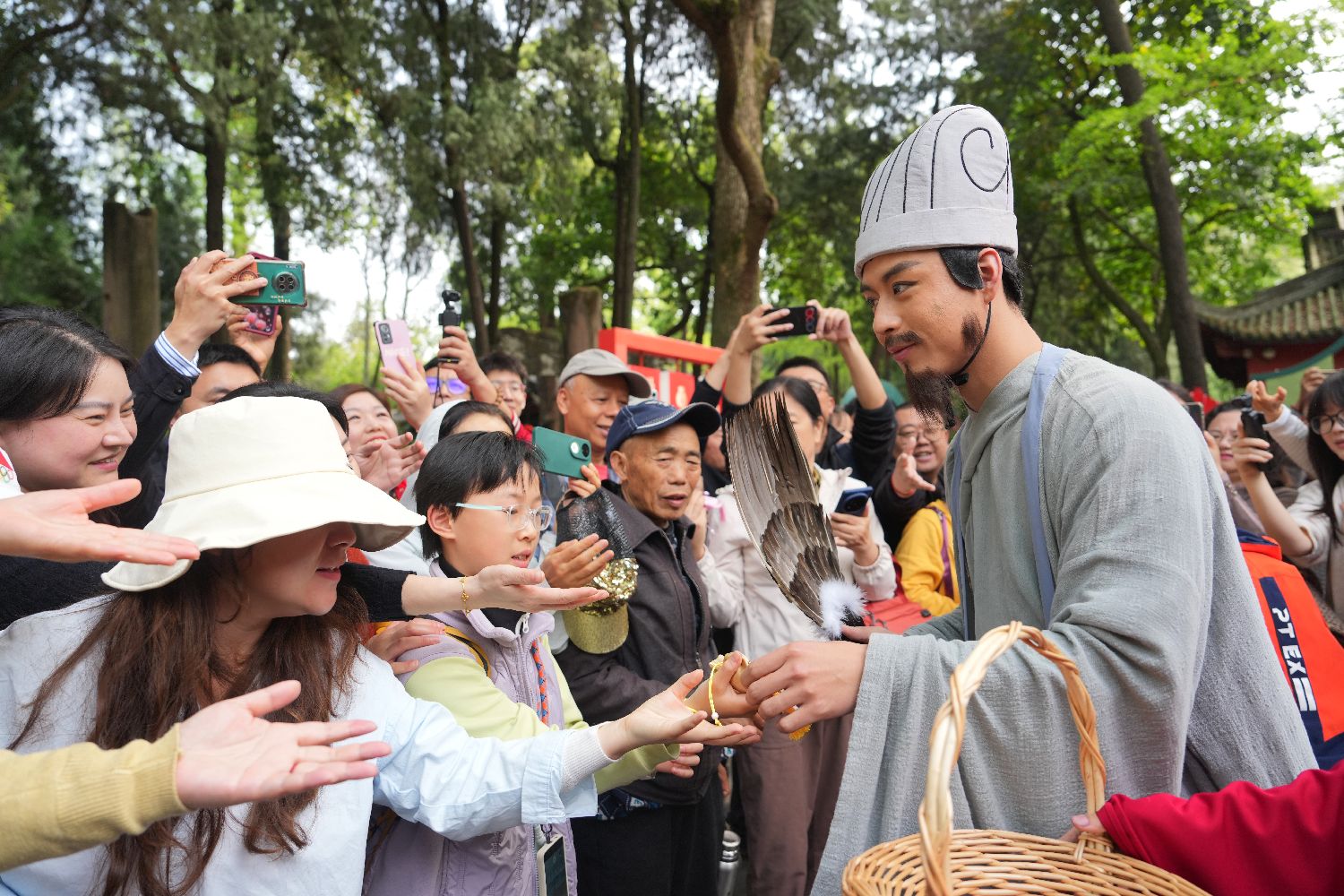 4月1日,四川成都,“诸葛亮”扮演者向游客送福袋。当日,成都武侯祠博物馆举办以“春遇武侯 拜见丞相”为主题的清明春假系列文化活动。本次活动紧扣清明节气的人文内涵,打造可观、可感、可参与的三国文化全景场域,为广大市民与游客奉上一场兼具精神厚度与传播新意的春日文化盛宴。(中新社)