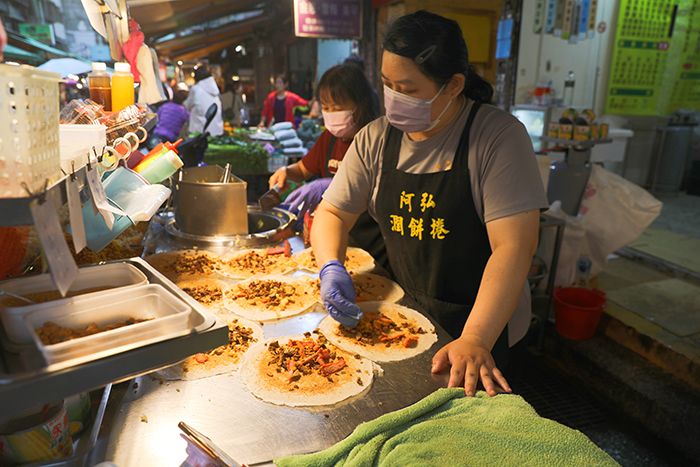 清晨6时,天光微亮,台北吴兴街市场已经热闹起来。“阿弘润饼卷”店的老板陈和锦,正利落地摊出一张张薄饼皮,空气中弥漫着面皮炙烤的焦香。这家“游牧式”经营二十多年的老摊,是许多台北人清明记忆的一部分。