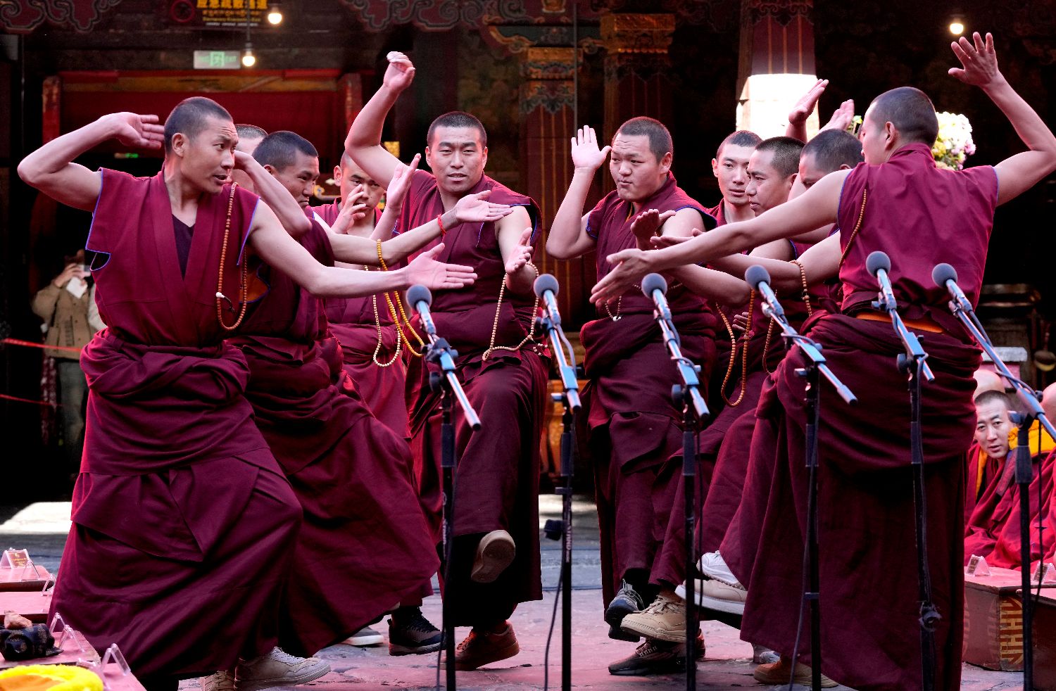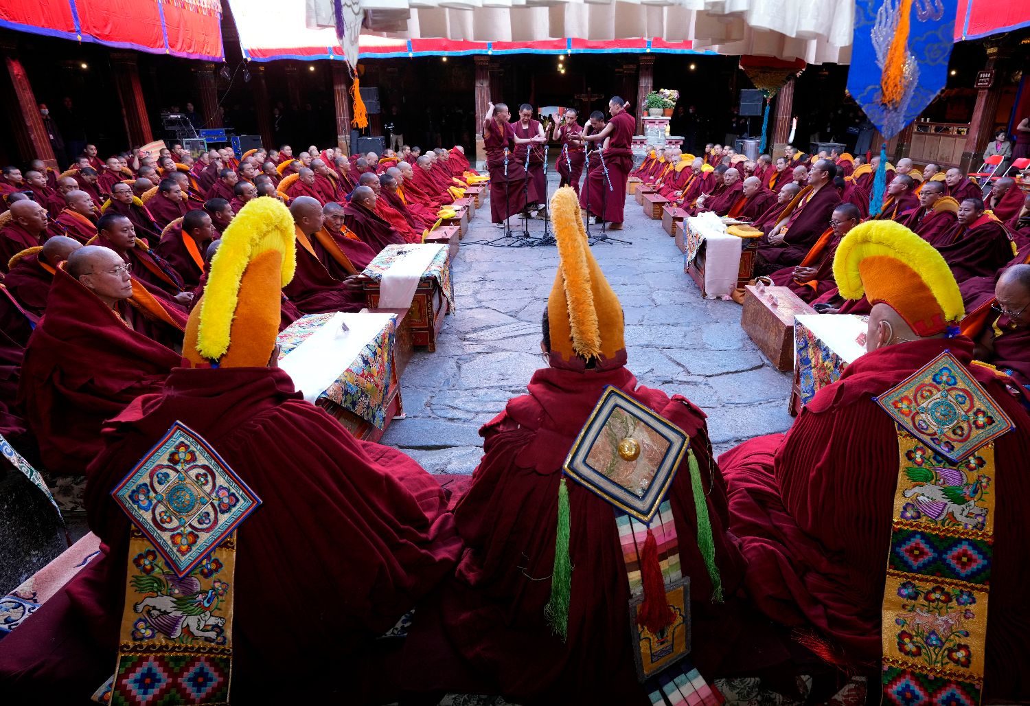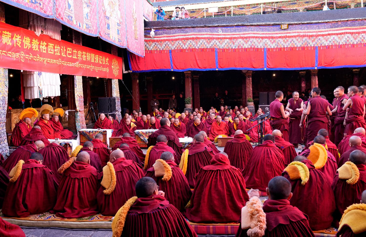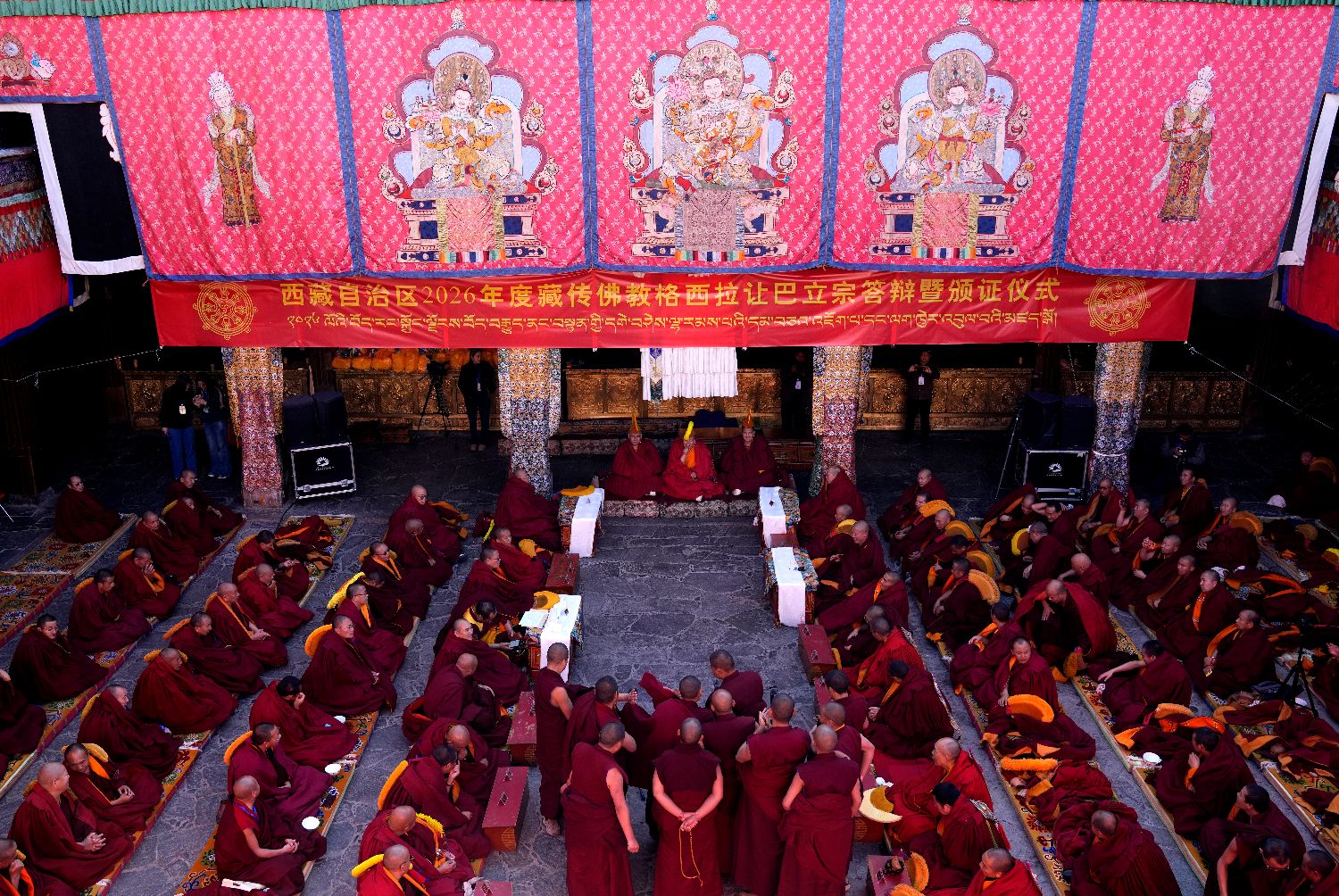 4月5日,2026年度藏传佛教格鲁派学经僧人考核晋升格西拉让巴学位立宗答辩暨颁证仪式在拉萨大昭寺举行。图为陪考僧人围绕藏传佛教五部经典向考僧提问。(中新社)