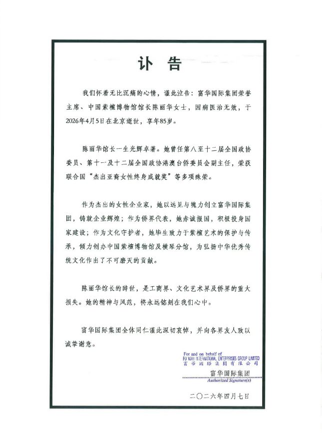 富华国际集团4月7日发布讣告:富华国际集团荣誉主席、中国紫檀博物馆馆长陈丽华女士,因病医治无效,于2026年4月5日在北京逝世,享年85岁。