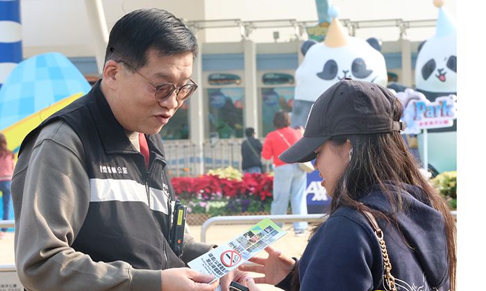 图为控烟酒办于主题公园门外向市民及游客介绍法例简章。(图/香港《文汇报》)