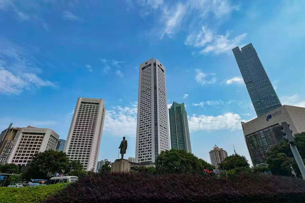 南京新街口孙中山铜像与现代化高楼。(图/中新社)