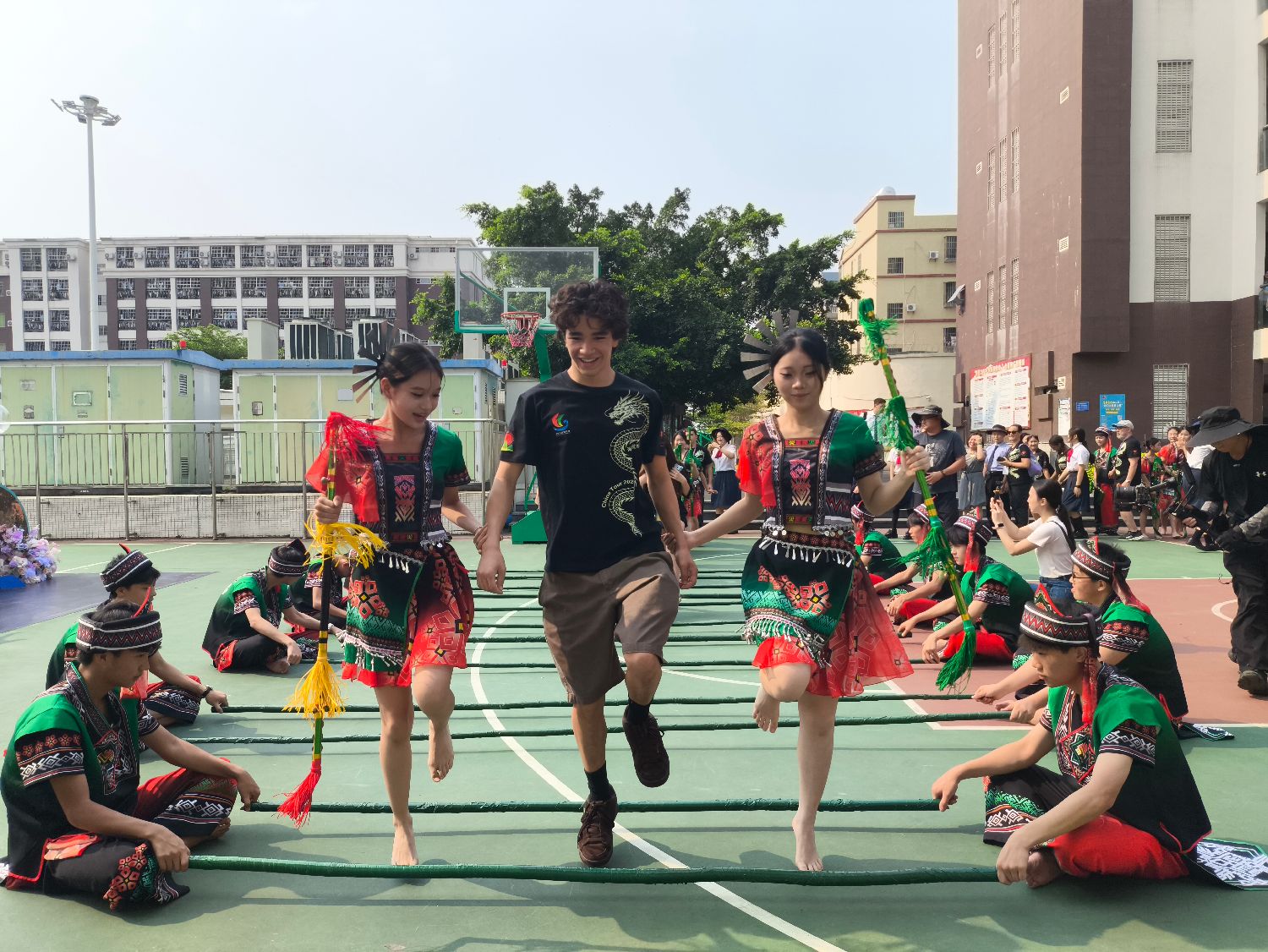 校园广场上,黎族特色的竹竿舞节奏明快,起初拘谨的美国学生在中国伙伴邀请下纷纷加入,手拉手跳跃,笑声与节拍交织在一起。