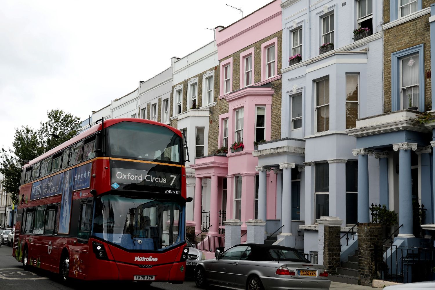 图为公共汽车从英国伦敦的一排房屋前驶过。(图/新华社)