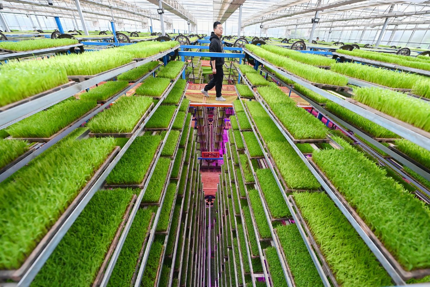 4月初,在湖南长沙县春华镇智能化育秧工厂,工作人员正在查看秧苗长势。(图/中新社)