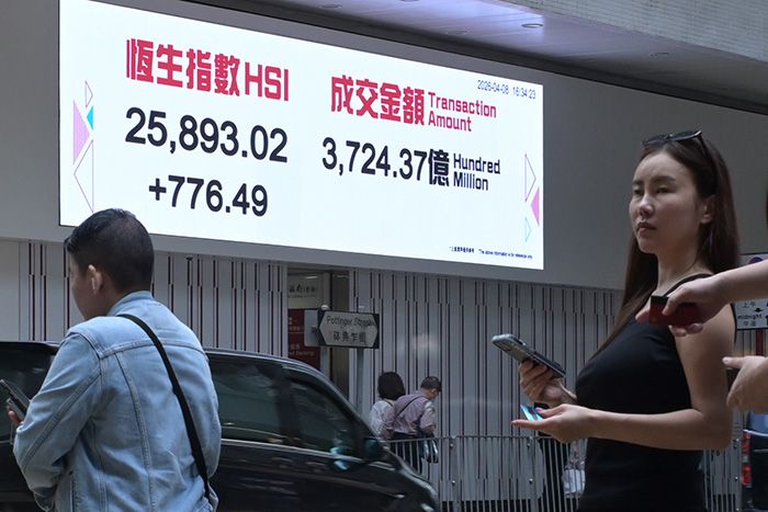 4月8日,香港恒生指数涨776.49点,涨幅3.09%,收报25893.02点。全日主板成交3724.37亿港元。(图/中新社)