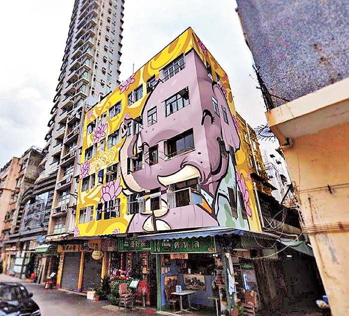 由泰国艺术家团队创作的增福楼壁画中的大象以泰国“合十礼”向途人打招呼。(图/香港文汇网)