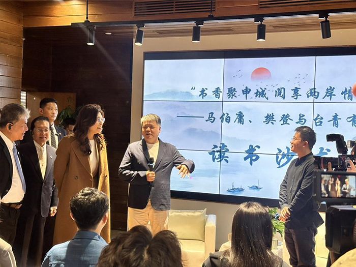 参访团坐车浏览了滨江水岸风光,并到当地的读书沙龙参观。那里正好在举行一场两岸青年交流活动,由大陆知名作家马伯庸等与台湾青年对谈。郑丽文对能见到马伯庸感到非常惊喜,并表示自己虽然没有时间看他的小说,改编的电视剧一直在看。