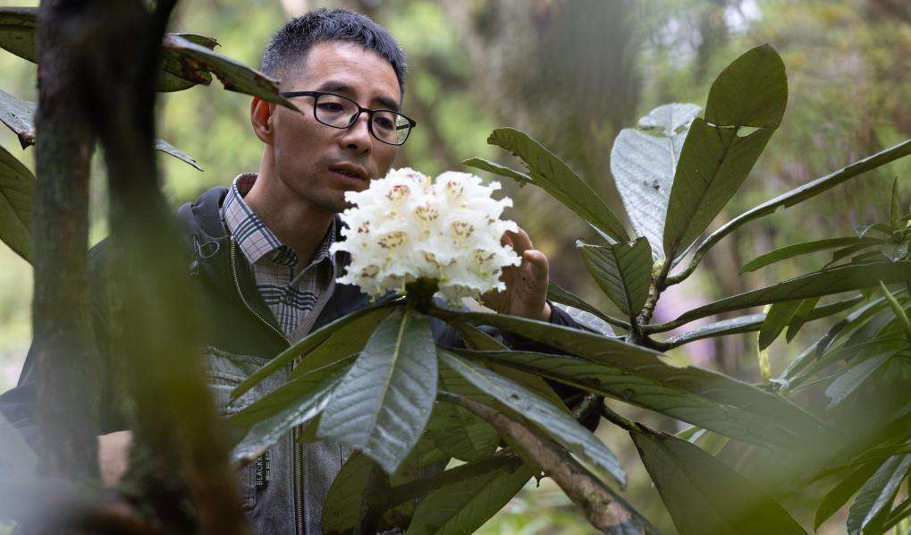 4月8日,在华西亚高山植物园,研究人员王飞在观察凸尖杜鹃开花的状态。近日,人工培育了29年的珍贵高山杜鹃——凸尖杜鹃,在位于四川省成都市都江堰龙池国家森林公园里的华西亚高山植物园首次开花。据华西亚高山植物园科研人员介绍,凸尖杜鹃是杜鹃花中叶片最长的种类,自然分布于云南、西藏高海拔原始林区,人工繁育周期长、难度大。目前开花的这株凸尖杜鹃长势良好,花序硕大,有花28朵,花冠呈乳黄色。据园区引种记录,这批凸尖杜鹃的种子于1997年10月采自云南省丽江市海拔3000米的原生境,科研人员在1998年春季在华西亚高山植物园完成播种育苗。这一成果填补了该物种在中国国内迁地保护的开花记录,为中国高山杜鹃保育、生物多样性研究提供了关键活体样本和实践经验。(新华社)