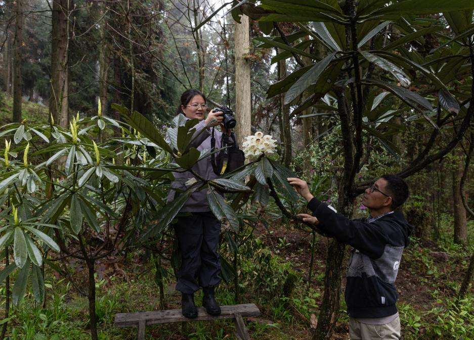 4月8日,在华西亚高山植物园,研究人员邵慧敏(左)和王飞在拍摄、记录凸尖杜鹃开花的状态。(新华社)