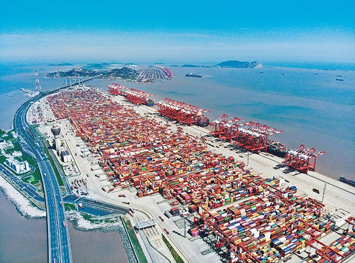 从上海临港驱车驶过32.5公里的东海大桥,上海洋山深水港巍然出现在天水相连处。这座见证两岸历史联结的现代化港口已是世界级的航运枢纽。